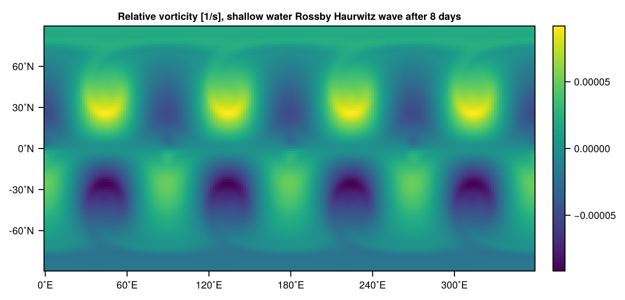 heatmap(vor, title="Relative vorticity [1/s], Rossby Haurwitz wave after 3 days")