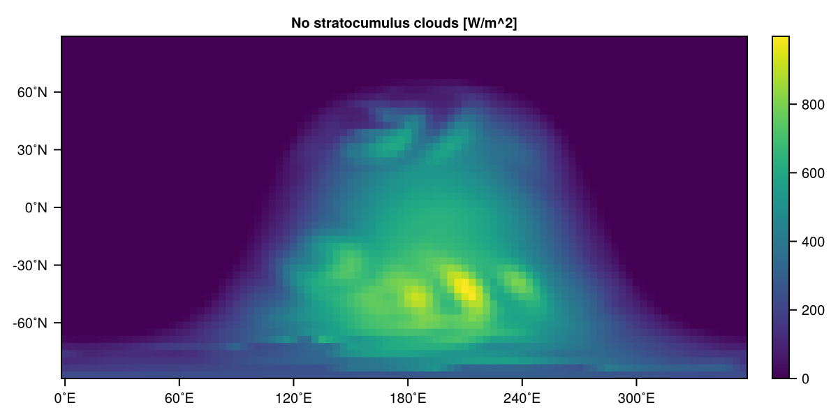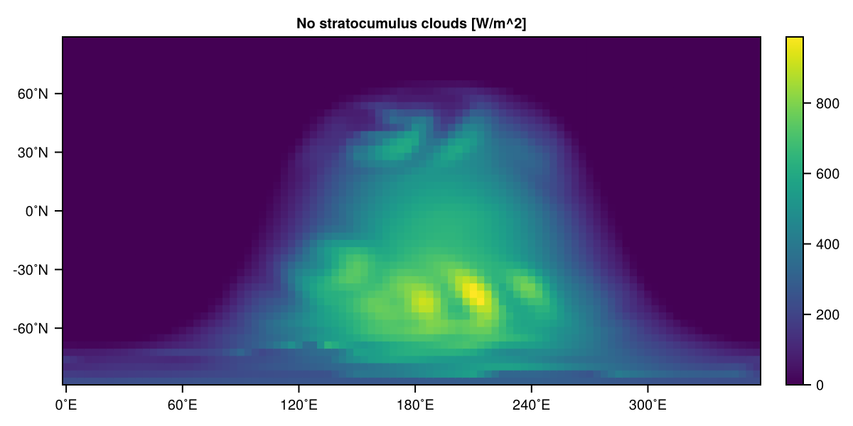 heatmap(ssrd, title="No stratocumulus clouds [W/m^2]")