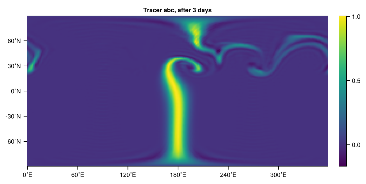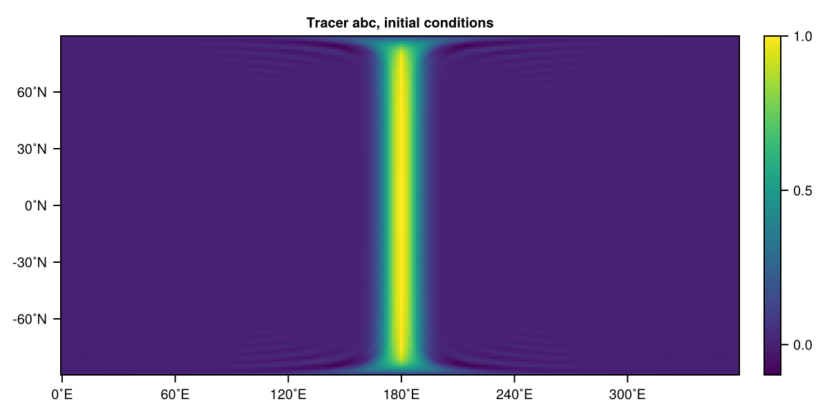 set!(simulation, abc=(λ, φ, σ) -> exp(-(λ-180)^2/10^2))The first one sets abc to a global constant (not super exciting), the second to some random values on a grid (transforms automatically!), and the third sets the tracer to a Gaussian ridge that runs through the Pacific (see Tracer visualisation below).