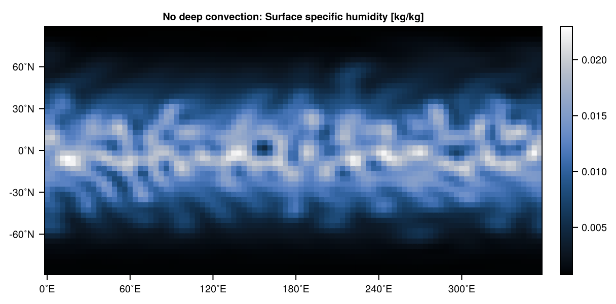 heatmap(humid, title="No deep convection: Surface specific humidity [kg/kg]", colormap=:oslo)