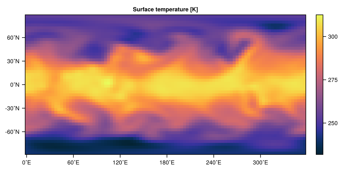 heatmap(temp, title="Surface temperature [K]", colormap=:thermal)