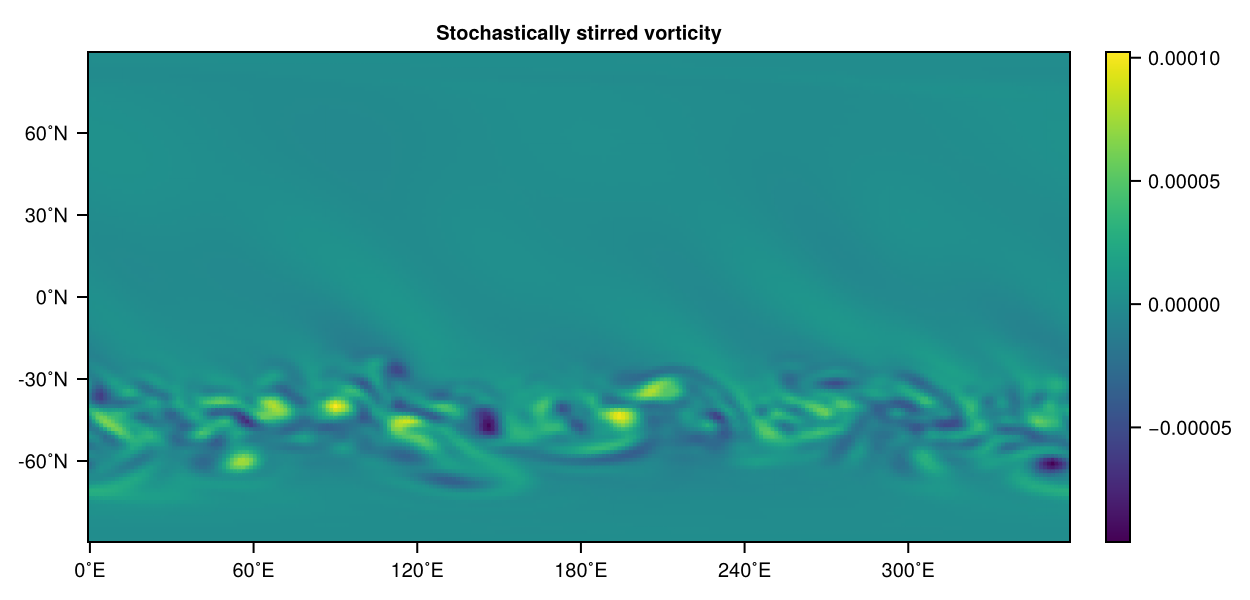 bar!(a, ...) # reads the scratch array a inNow back to the stochastic stirring. For the last lines in forcing! we have to know the order in which different terms are written into the tendencies for vorticity, vars.tendencies.vorticity. In SpeedyWeather, the forcing! comes first, then the drag! (see Custom drag) then the curl of the vorticity flux (the vorticity advection). This means we can transform S_grid directly back into vor_tend without overwriting other terms which, in fact, will be added to this array afterwards. In general, you can also force the momentum equations in grid-point space by writing into vars.tendencies.grid.u and vars.tendencies.grid.v.