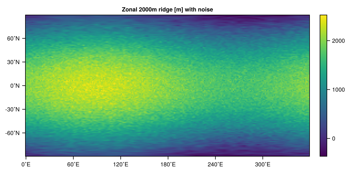 heatmap(model.orography.orography, title="Zonal 2000m ridge [m] with noise")