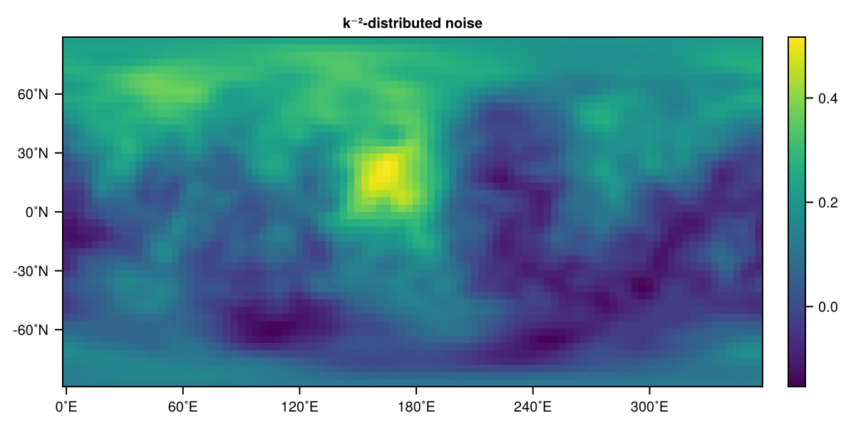 0.0+0.0im 0.0+0.0im 0.0+0.0imYay, we just chopped off alms which contained the harmonics up to degree and order 5 before. If the second argument in spectral_truncation is larger than alms then it will automatically call spectral_interpolation and vice versa. Also see Interpolation between grids to interpolate directly between grids. If you want to control directly the resolution of the grid you want to transform onto, use the keyword dealiasing (default: 2 for quadratic, see Matching spectral and grid resolution). But you can also provide a SpectralTransform instance to reuse a precomputed spectral transform. More on that now.